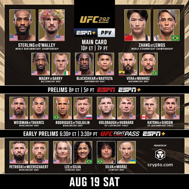 UFC 292: Sterling vs. O’Malley was a mixed martial arts event produced by the Ultimate Fighting Championship that took place on August 19, 2023, at the TD Garden in Boston, Massachusetts, United States.